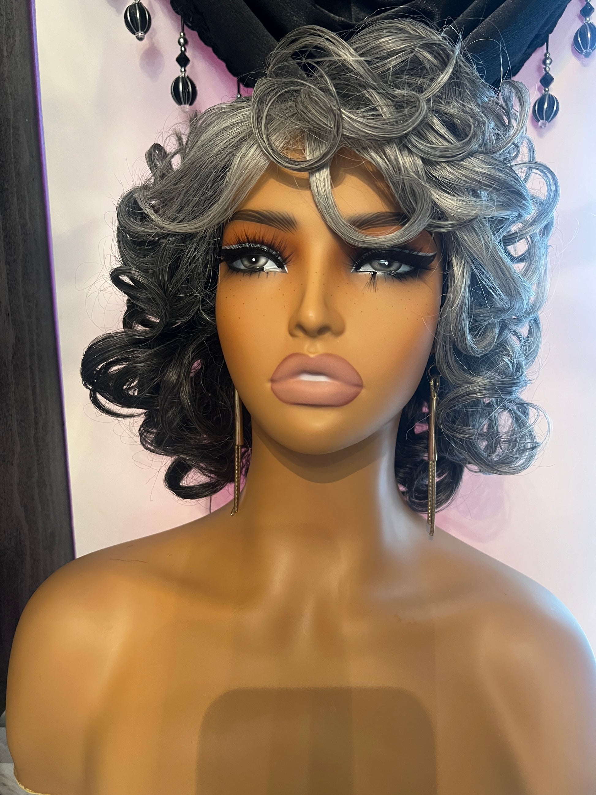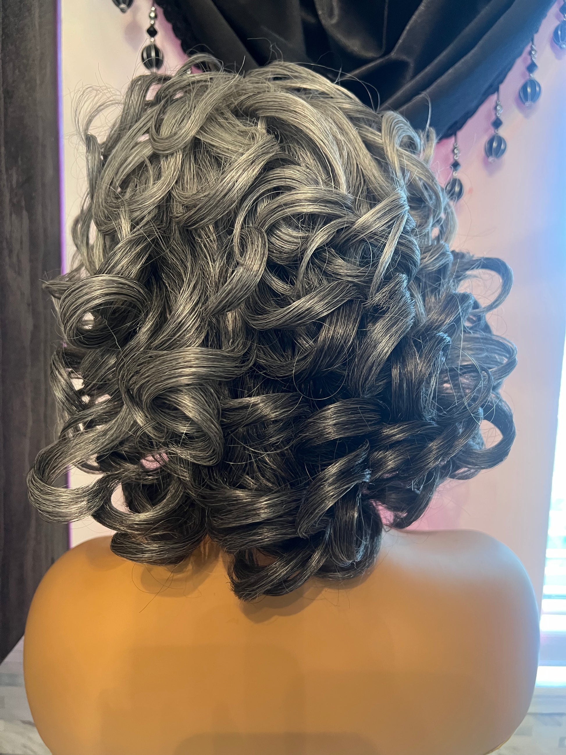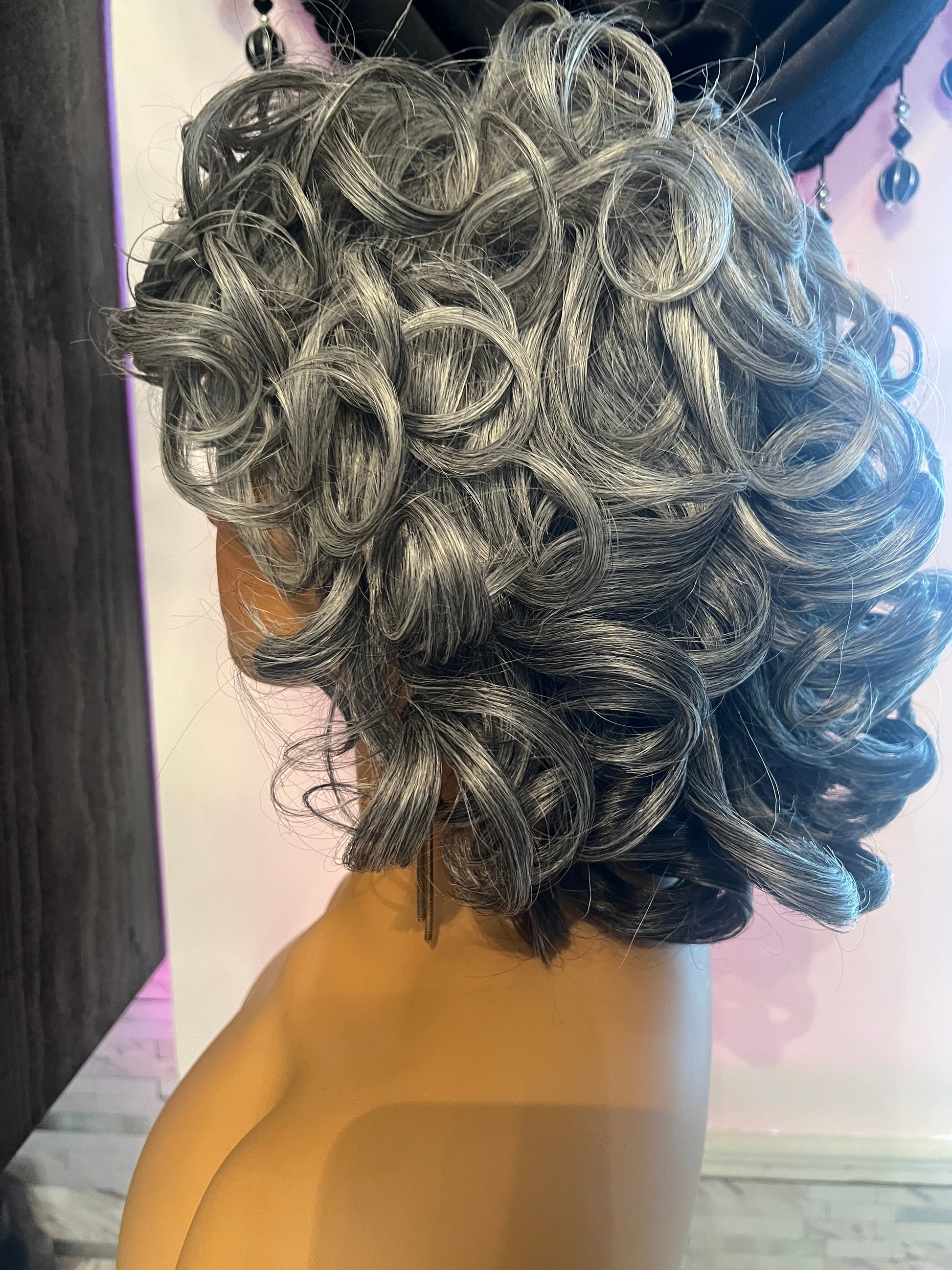 Salt & pepper curly wig. This wig can be styled in different ways.